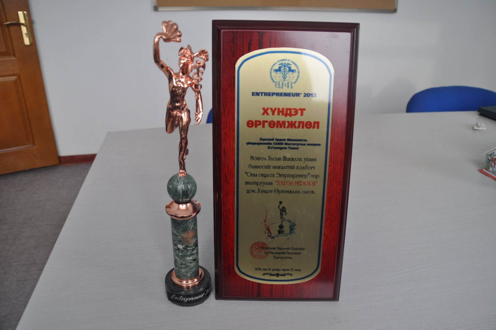 засгийн хөгжилд бодитой хувь нэмэр оруулж буй аж ахуйн нэгж, байгууллага, бизнес эрхлэгчдийг тодруулан шалгаруулах “ENTREPRENEUR-2012” арга хэмжээний Монгол улсын шинжлэх ухаан, бизнесийг холбогч “Оны онцлох интрепренер”-ийн “ХҮРЭЛ МЕРКУРИ” цом, хүндэт өргөмжлөл,